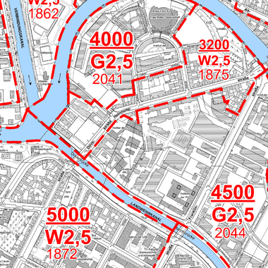 Karte der durch den Gutachterausschuss für Grundstückswerte in Berlin zum 01.01.2019 ermittelten Bodenrichtwerte.