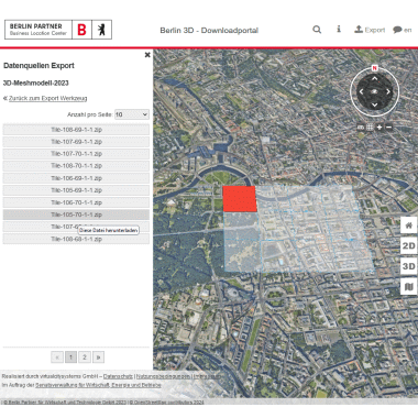 Das Berlin 3D Downloadportal ist ein Dienst, der es Nutzer*innen ermöglicht, ein 3D-Meshmodell von Berlin zu betrachten und Datenkacheln des 3D-Meshmodells herunterzuladen. Das 3D-Meshmodell wurde durch Dense-Image-Matching Verfahren aus einem Multiperspektiv-Bildflug aus dem August 2023 gewonnen. Je Datenkachel wird ein ZIP-Archive bereitgestellt, welches die Geometrien und Texturen einer Kachel enthält. Als Dateiformat für das 3D-Mesh wird ausschließlich OBJ angeboten.