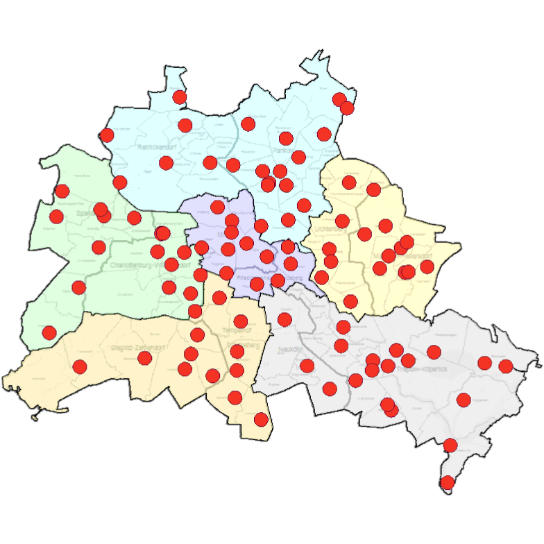 Standorte der Berliner Feuerwehr (Berufsfeuerwehr und Freiwillige Feuerwehr) sowie Einsatzbereiche