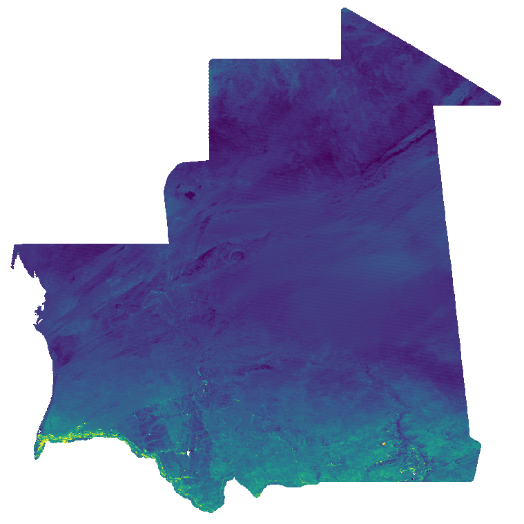 Normalized Difference Vegetation Index (NDVI) from MODIS data for Mauritania at 30 arc seconds (ca. 1000 meter) resolution (2019 - 2023). Source data: - MODIS/Terra Vegetation Indices 16-Day L3 Global 1 km SIN Grid (MOD13A2 v061): https://lpdaac.usgs.gov/products/mod13a2v061/ The Terra Moderate Resolution Imaging Spectroradiometer (MODIS) Vegetation Indices 16-Day (MOD13A2) Version 6.1 product provides Vegetation Index (VI) values at a per pixel basis at 1 kilometer (km) spatial resolution. There are two primary vegetation layers. The first is the Normalized Difference Vegetation Index (NDVI), which is referred to as the continuity index to the existing National Oceanic and Atmospheric Administration-Advanced Very High Resolution Radiometer (NOAA-AVHRR) derived NDVI. The second vegetation layer is the Enhanced Vegetation Index (EVI), which has improved sensitivity over high biomass regions. The algorithm for this product chooses the best available pixel value from all the acquisitions from the 16 day period. The criteria used is low clouds, low view angle and the highest NDVI/EVI value. For the time period January 2019 - December 2023, the NDVI layer of the original data has been processed. Bad quality pixels or pixels with snow/ice and/or cloud cover have been masked using the provided quality assurance (QA) layers and appear as "no data". These 16-Day data are then aggregated to monthly temporal resolution using the maximum and reprojected to Latitude-Longitude/WGS84. File naming: ndvi_filt_YYYY_MM_01T00_00_00.tif e.g.: ndvi_filt_2023_12_01T00_00_00.tif The date within the filename is year and month of aggregated timestamp. Pixel values: NDVI * 10000 Scaled to Integer, example: value 6473 = 0.6473 Projection + EPSG code: Latitude-Longitude/WGS84 (EPSG: 4326) Spatial extent: north: 28N south: 14N west: 18W east: 4W Temporal extent: January 2019 - December 2023 Spatial resolution: 30 arc seconds (approx. 1000 m) Temporal resolution: monthly Software used: GRASS GIS 8.3.2 Format: GeoTIFF Original dataset license: All data products distributed by NASA's Land Processes Distributed Active Archive Center (LP DAAC) are available at no charge. The LP DAAC requests that any author using NASA data products in their work provide credit for the data, and any assistance provided by the LP DAAC, in the data section of the paper, the acknowledgement section, and/or as a reference. The recommended citation for each data product is available on its Digital Object Identifier (DOI) Landing page, which can be accessed through the Search Data Catalog interface. For more information see: https://lpdaac.usgs.gov/products/mod13a2v061/ Processed by: mundialis GmbH & Co. KG, Germany (https://www.mundialis.de/) Contact: mundialis GmbH & Co. KG, info@mundialis.de Acknowledgements: This study was partially funded by EU grant 874850 MOOD. The contents of this publication are the sole responsibility of the authors and don't necessarily reflect the views of the European Commission.